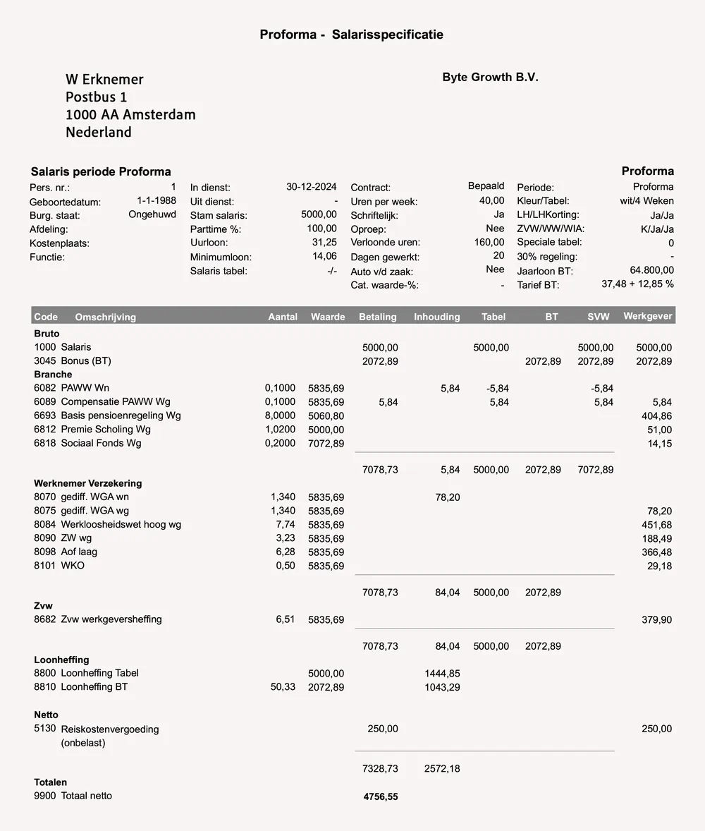 Iedere werkgever betaalt over het brutoloon werkgeverslasten. Denk hierbij aan premies voor de AOW, WIA, WW en ziektewet. Je kunt uitgaan van een grove schatting van 30 % van de kosten van het brutoloon als werkgeverslasten. Dit betalen wij over jouw basissalaris en halen wij van jouw omzet af om de lasten van jouw bonus te betalen.